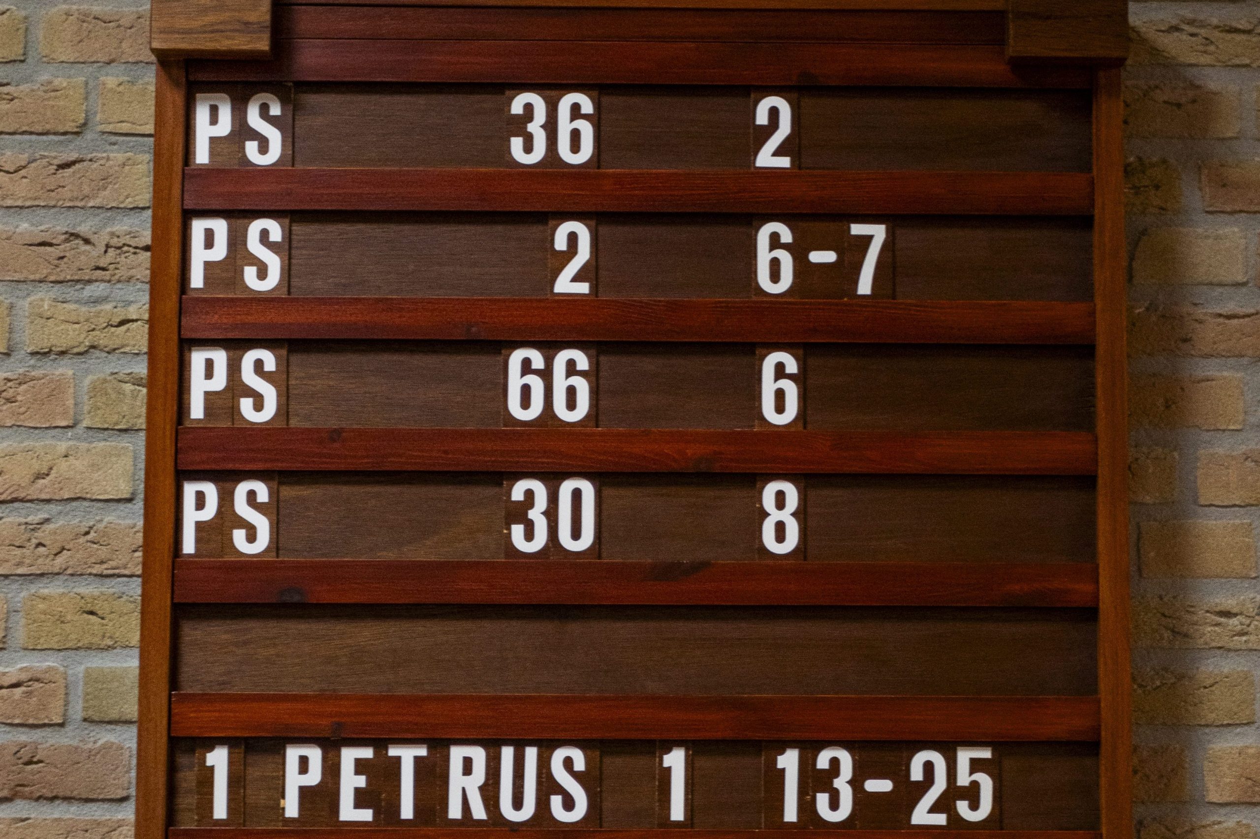 De psalmen en het te lezen Bijbelgedeelte staan aangegeven op de liturgieborden voorin de kerk.